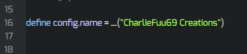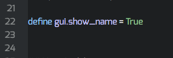 Esta variable recoje una cadena de texto (String) con el nombre que le das a tu juego. La variable muestra este nombre en la parte superior de la ventana del juego (en PC), en el menú principal del juego y en los archivos Traceback que reportan los errores de código existentes en tu juego. No es necesario ocupar el “_()” ya que este se usa para señalar a esa String como un texto traducible (Ren’Py cuenta con una característica para traducir el juego).