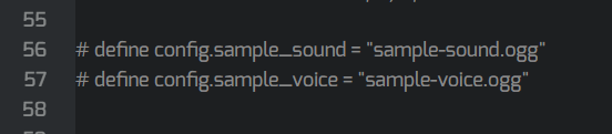 Esta variable recoge mediante una string, la ruta de un archivo de sonido que esté al interior de la carpeta “/game” de tu juego, que luego se usará en el menú “Ajustes” con un botón que pone “Probar” al costado del máster de Sonido correspondiente, para que el jugador pueda probar el volumen de ese canal. Si presionas ese botón en el menú, siendo el de “sound” o el de “voice”, el archivo indicado en la String se reproducirá en el canal que corresponde. Es opcional agregar esto al juego. Si quieres ocuparla, debes descomentar (quitar el símbolo #).