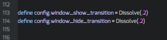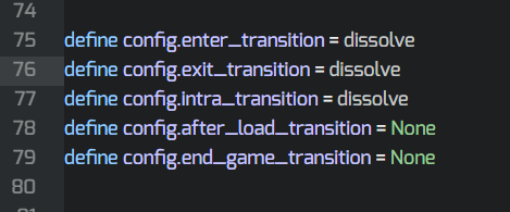 Mediante estas variables, puedes definir los efectos de transición que se mostrarán al ir de una capa del juego a otra, como cuando te desplazas de un menú a otro, cuando cargas una partida guardada del juego o cuando finalizas el juego (pasando por return). Las transformaciones permitidas para estas transiciones son fade (Disuelve la capa en un fondo negro) y dissolve (Disuelve la capa en la capa nueva).