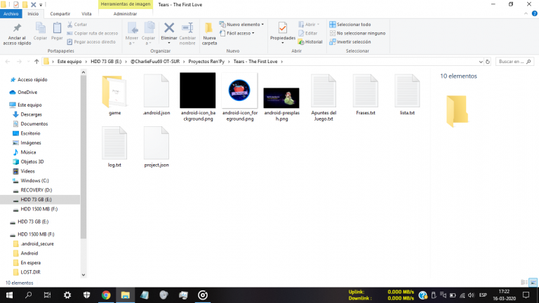 - game : En esta carpeta, se ubican todos los Assets del juego. Aquí es donde están reunidas las imágenes que brindan el diseño de interfaz al juego, las imágenes de escenarios, los Sprites de los personajes, los archivos de sonido y nuestros scripts con código.