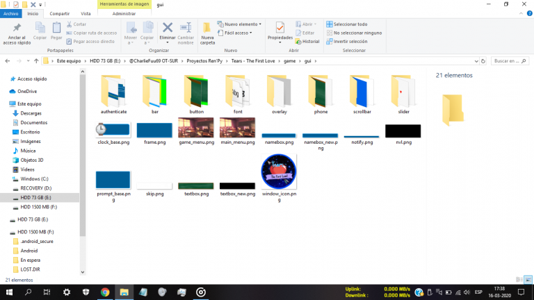 [Screenshot de la carpeta “gui” que contiene los iconos de botones, tipografías y diseño gráfico de mi juego – Proyecto TTFL! de CharlieFuu69 Creations!]