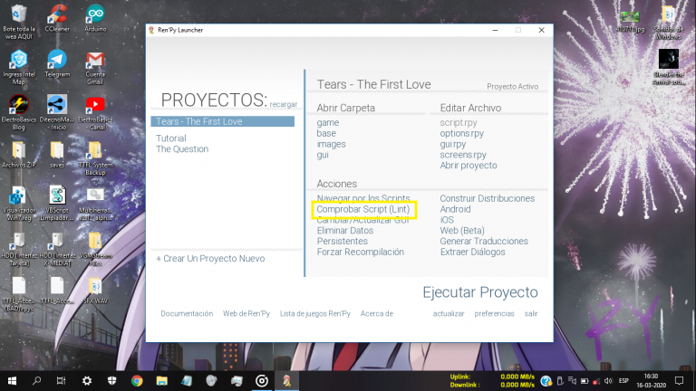 Comprobar Script (Lint) : El “Lint” es posiblemente la herramienta que más vamos a ocupar durante el desarrollo de nuestro juego, ya que este tiene la función de generar un reporte de posibles errores en nuestro código, la cantidad de palabras, caracteres y menús creados dentro del juego.