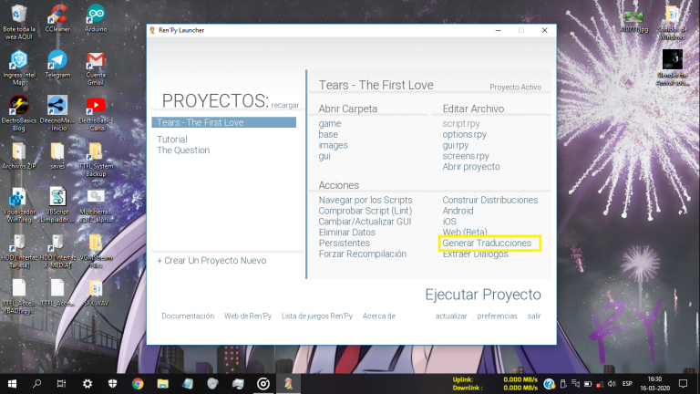 Generar Traducciones : Esta herramienta traduce nuestro juego (Diálogos y botones) a otro idioma que deseemos, pero esta herramienta funciona si ajustamos correctamente nuestro código, ya que el proceso de traducción solo lee y traduce lo que le indicamos en nuestros scripts. Además, si queremos traducir nuestro juego a idiomas como el Chino Mandarín o el Japonés, debemos estar conscientes de que las fuentes tipográficas que tenemos para nuestro juego, son compatibles con idiomas de glifos. Más adelante enseñaré a usar esta herramienta.