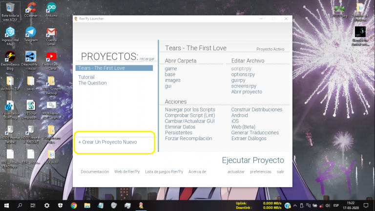 Paso 1 : Abre el lanzador de Ren’Py y presiona el texto que pone “Crear Un Proyecto Nuevo”. Después de presionar, Ren’Py nos mostrará una pantalla con los ajustes preliminares para crear el proyecto.