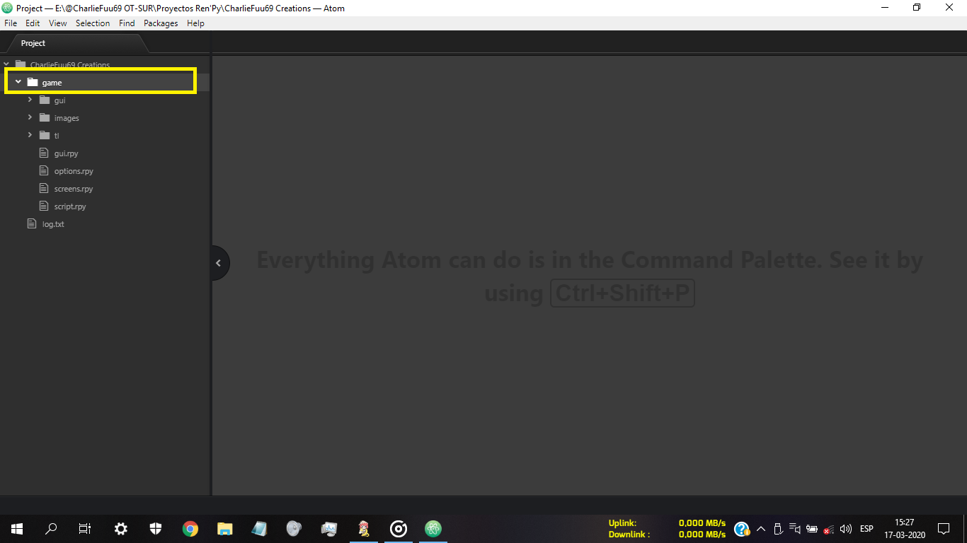 2.1 DENTRO DEL EDITOR DE TEXTO : En este punto, ya se abrió el editor de texto que instalaste en el motor. Sugiero que uses Atom como editor. Es bastante bueno y estético a la hora de picar código.