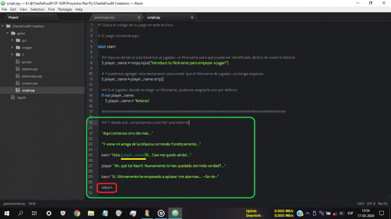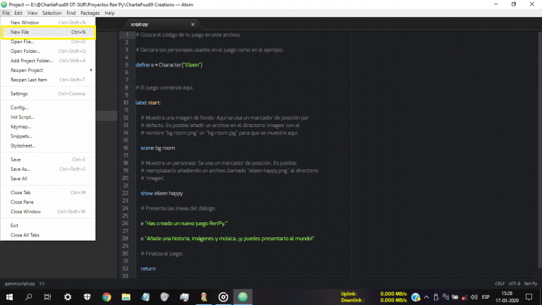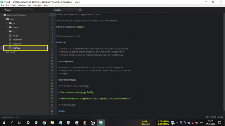 Paso 1 : En este punto, ya podemos empezar a escribir nuestra historia. Retornemos al archivo “script.rpy”.