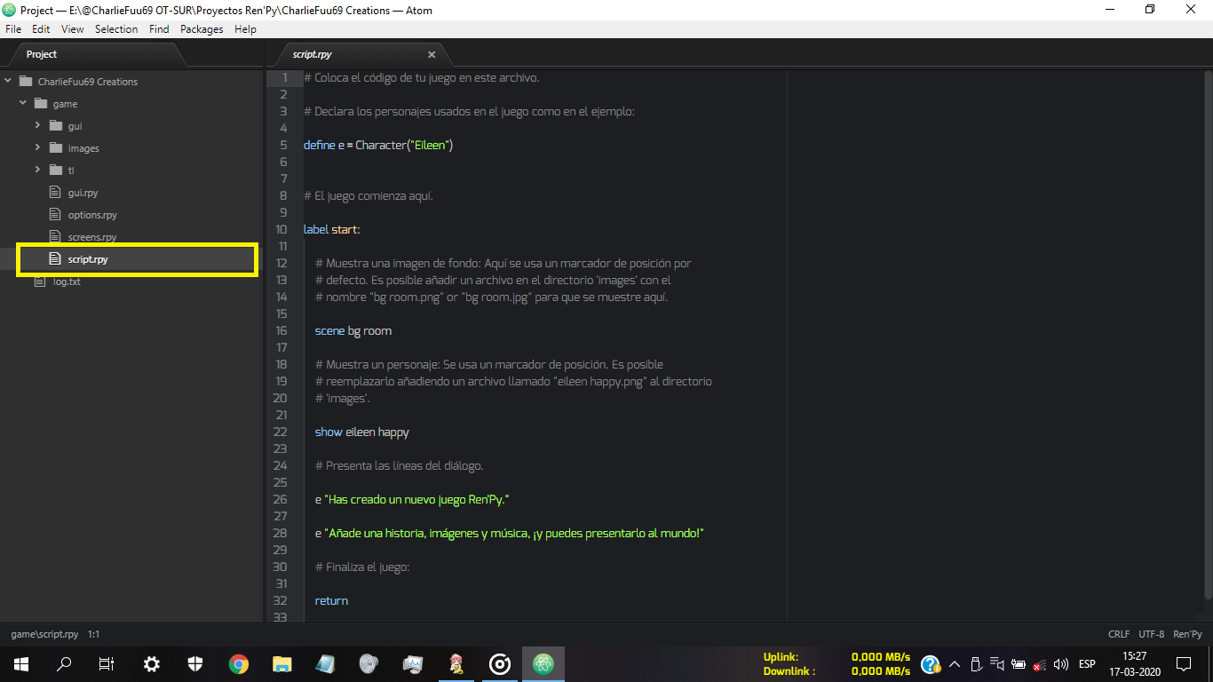 Abre el archivo “script.rpy”. En ese archivo escribirás los diálogos de tu novela visual. Ren’Py te dará una mano con algunas instrucciones básicas pero te las detallaré ahora.