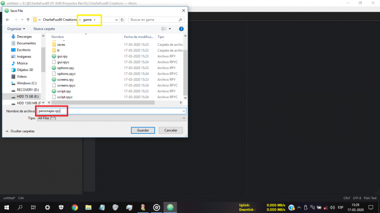 Paso 2 : Asegúrate de guardar el archivo dentro de la carpeta “game”. Luego puedes renombrar tu archivo como “Personajes”, siempre y cuando le coloques la extensión “.rpy” en el nombre de archivo.