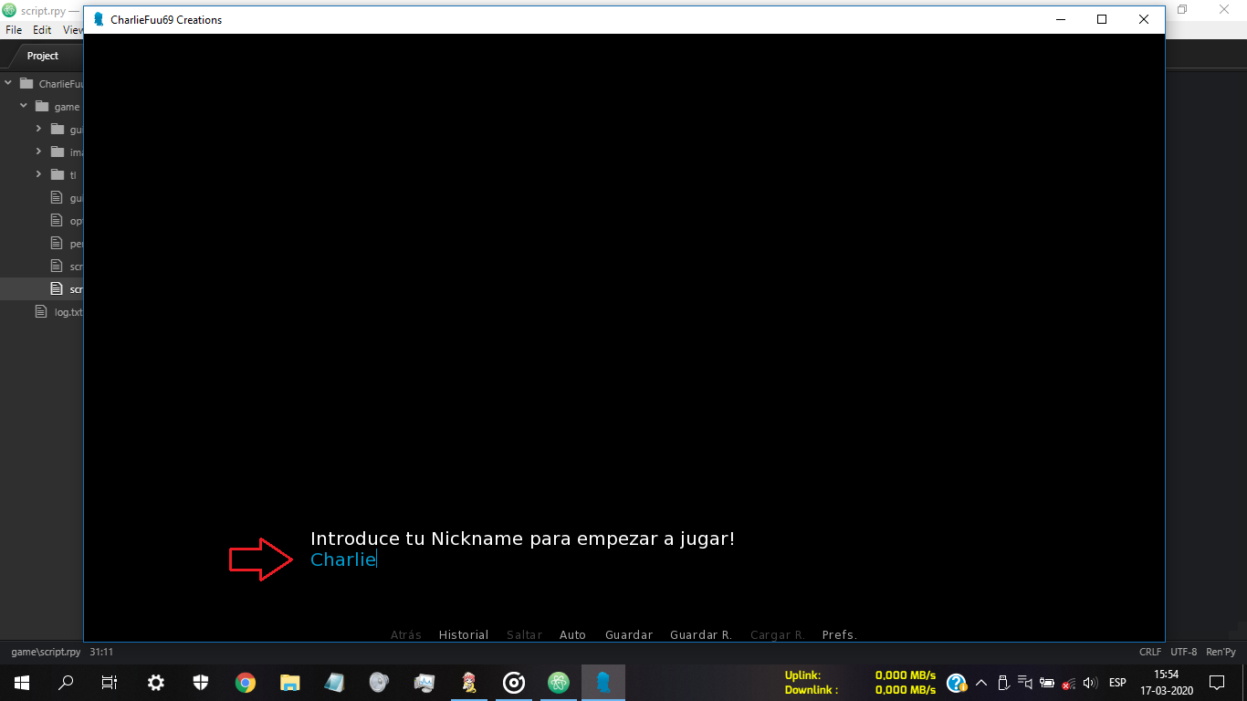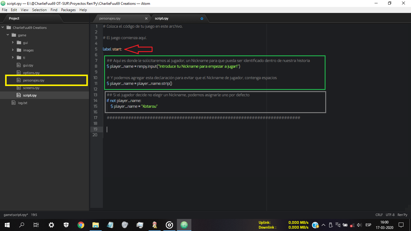 Bajo nuestra petición de Nickname, empezaremos a desenvolver la creatividad literaria que llevamos dentro. PERO OJO!!!, escribe todo dentro del indentado de label start.