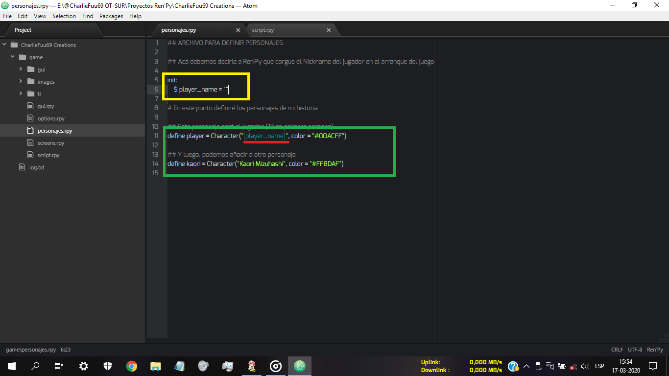 Paso 5 : Ahora, entraremos al archivo “personajes.rpy” para definir nuestros personajes partícipes en la historia.