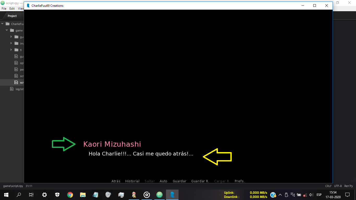 Paso 2 : Recuerdas que tuviste que definir a los personajes?. Y que para eso, usaste una etiqueta para llamarlos?. Las etiquetas que ocupamos en este post, fueron player (El jugador), y kaori (La personaje Kaori Mizuhashi). Ahora es momento de ocuparlas.