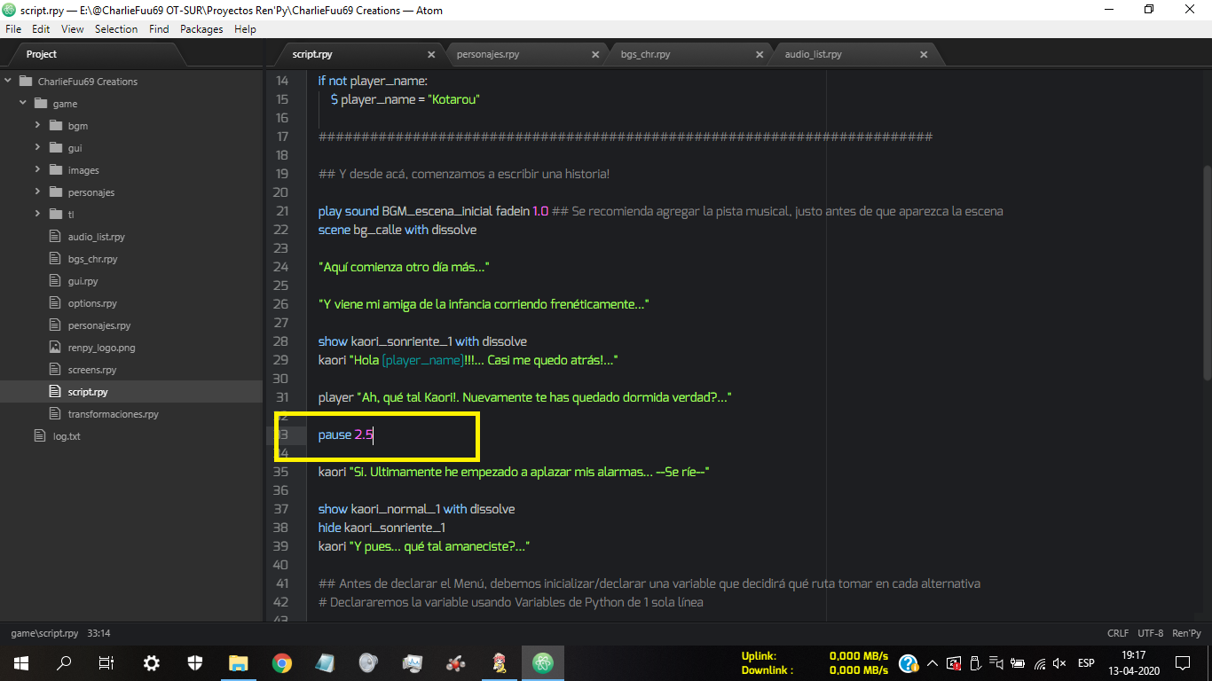 Las declaraciones de pausa en el juego, se ejecutan únicamente en la capa de la historia (label), pero son pausas que sí o sí, están determinadas por tiempo (No son pausas infinitas).